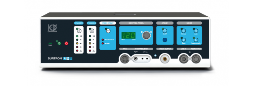 The Surtron ABC It is an optional module for electrobisturi that introduces the coagulation technology to Argon, a non-contact method that exploits a flow of argon inert gas combined with high frequency current to obtain a controlled, homogeneous and rapid surface coagulation.