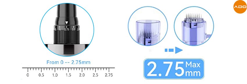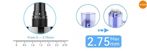 - Needle length: The adjustable dial changes the needle length from 0.25 mm to 2.75 mm, depending on the intensity of the required treatment. The adjustment allows more delicate treatments for the skin of the face and more intensive for the body.