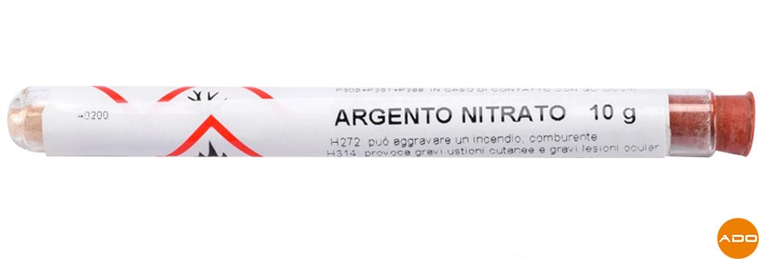 Silver nitrate is a chemical substance with caustic properties that reacts with the treated tissues. When applied to the surface of the skin, silver nitrate acts to cauterize growths, such as fibromas or warts, destroying excess cells and promoting their natural removal over time.